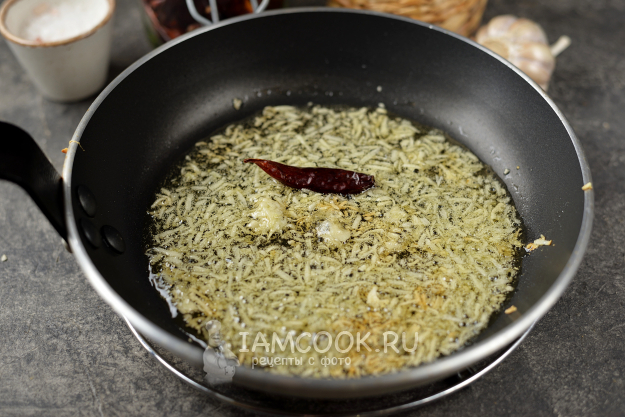 Поставьте сковороду на средний огонь, следите за чесноком, он не должен стать коричневым, иначе масло начнет горчить. Сразу же добавьте острый перчик. В оригинальном рецепте перец кладут вместе с семечками, но для меня это слишком остро, поэтому их я удаляю, вы же ориентируйтесь на свой вкус.