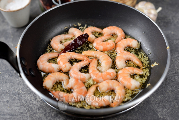 Положите в сковороду креветки, они должны плавать в ароматном масле.