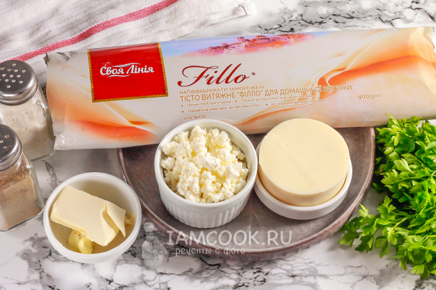Подготовьте необходимые ингредиенты для создания румяных хачапури из теста фило с сыром на сковороде.