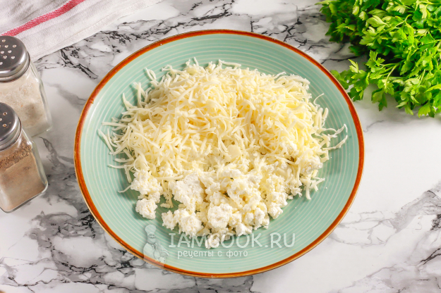 Творог любой жирности выложите в глубокую емкость или тарелку и натрите туда же сыр на терке с мелкими ячейками.