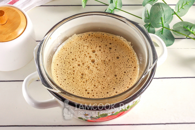 Влейте кофе и быстро перемешайте. Поместите емкость на водяную баню (кастрюлю с водой). Заварите крем с момента закипания воды в кастрюле примерно 10-12 минут. Не торопитесь и дождитесь загустения, мешайте крем венчиком. Вам будет казаться, что масса слишком жидкая и не загустится, но важно набраться терпения - все будет!