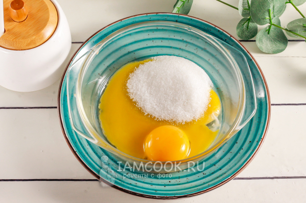 Так как крем необходимо заварить на водяной бане, то приготовьте стеклянную или фаянсовую емкость с ручками, чтобы ее можно было поместить на кастрюлю или казан. Выложите в нее желтки и всыпьте сахар. Взбейте все венчиком, чтобы хорошо перемешалось.