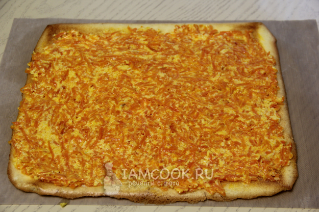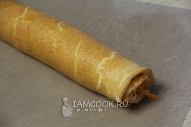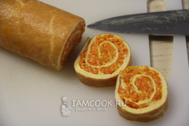Горячий омлет перевернуть на пергамент и снять коврик, на котором выпекался омлет. Смазать тёплый омлет морковной начинкой.