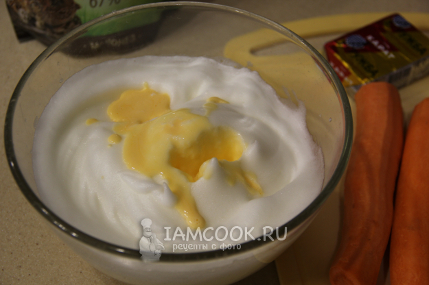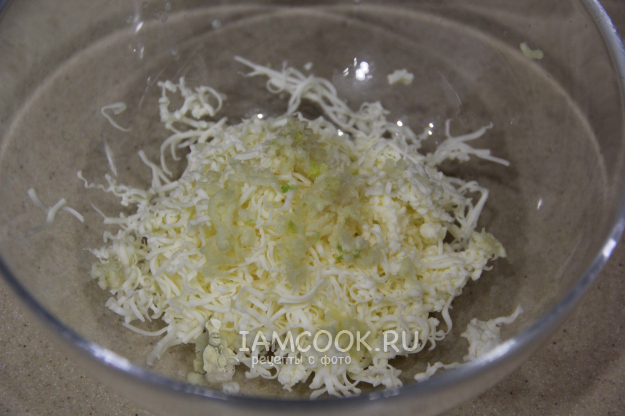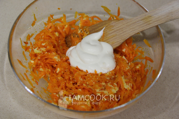 Добавить к сырку теплую морковь. Перемешать и добавить майонез и чеснок, пропущенный через пресс. Перемешать начинку.