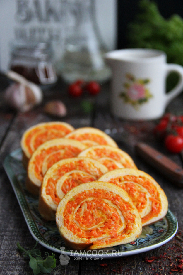 Свернуть омлет в плотный рулет и завернуть в пергамент. Убрать яичный рулет с морковью в холодильник на пару часов, я убрала на ночь.