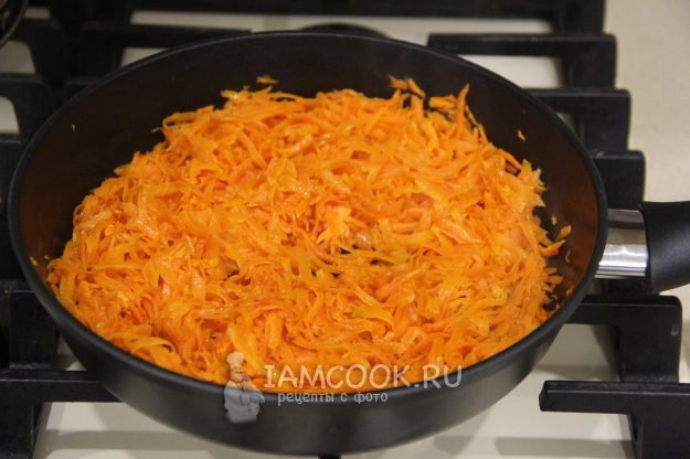 Пока готовится омлет, приготовить начинку. Морковь натереть на терке, выложить в сковороду с добавлением растительного масла и обжарить в течение 15 минут до мягкости.
