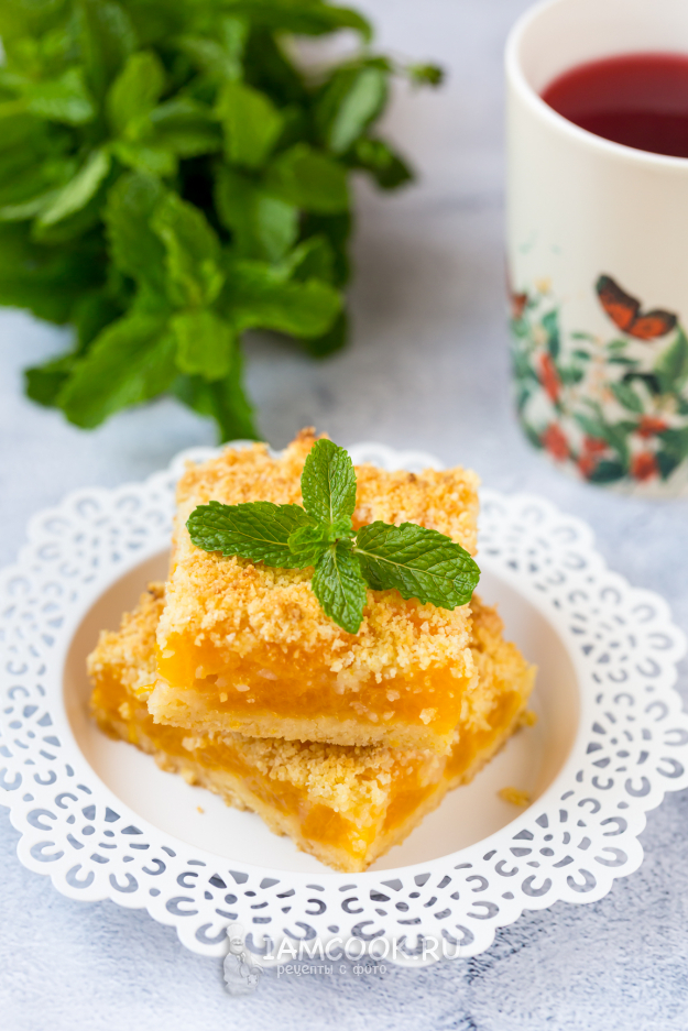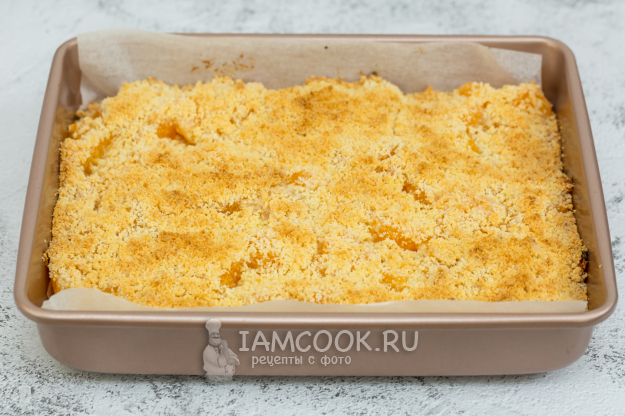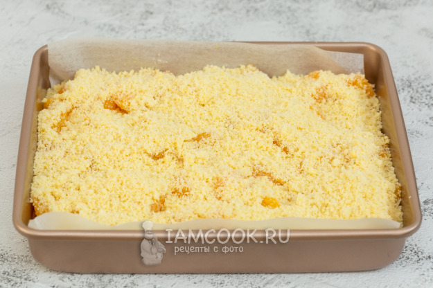 Большую часть крошки-теста выложите в форму, застеленную пергаментом, и слегка утрамбуйте.