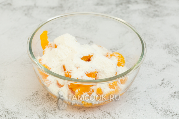 Выпекайте насыпной пирог с мандаринами в разогретой до 180 градусов духовке 40 минут.