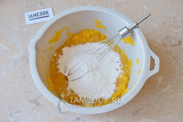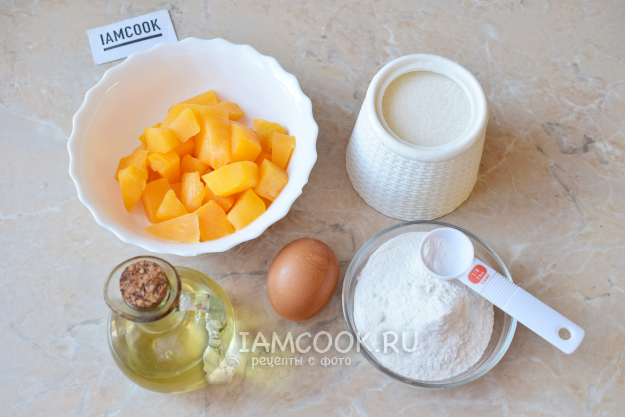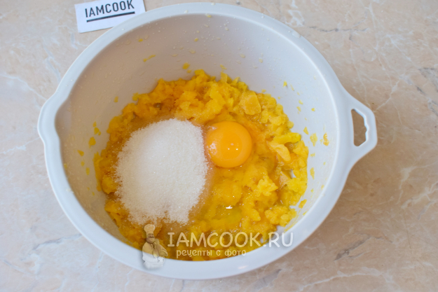 К измельченной тыкве добавьте яйцо и немного сахара. Количество сахара можно изменить по своему вкусу.