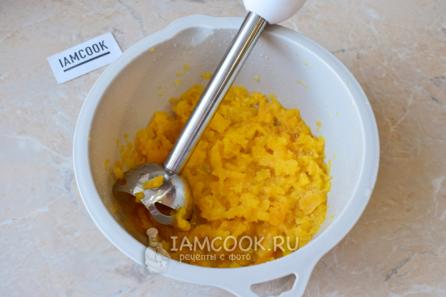Свежую тертую тыкву можно сразу добавлять в тесто. Размороженную тыкву необходимо измельчить. Можно размять её толкушкой или воспользоваться погружным блендером. Я немного измельчила тыкву блендером, но не до состояния пюре, а чтобы оставались небольшие кусочки.