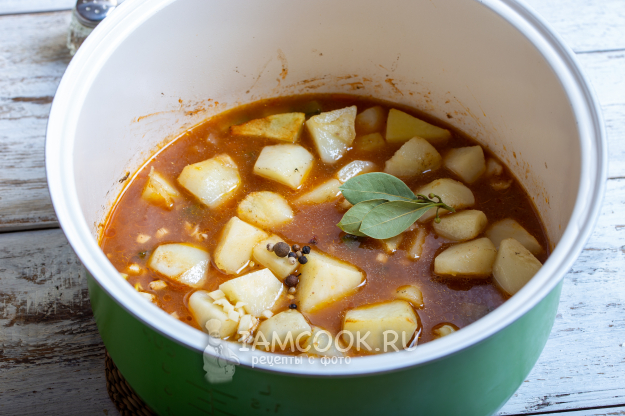 Когда мясо станет мягким, добавьте обжаренный картофель, измельчённый чеснок, соль, перец и лавровый лист. Продолжайте тушить азу из говядины в мультиварке до готовности картофеля - около 15-20 минут.