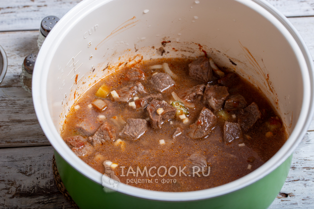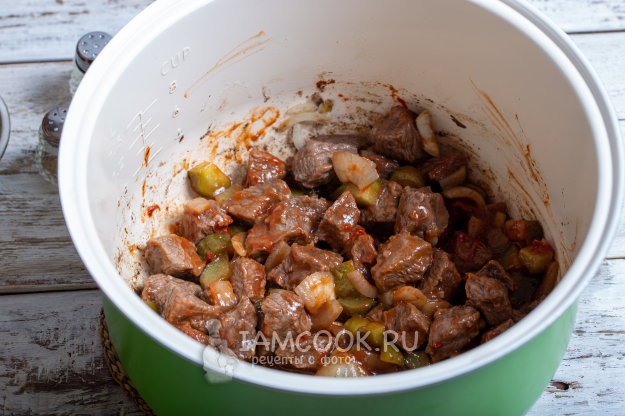 Добавьте один измельчённый чеснок, влейте горячей воды, так, чтобы она слегка прикрывала мясо. Включите режим «Тушение» и готовьте говядину 1-1.5 часа, в зависимости от выбранного мяса.