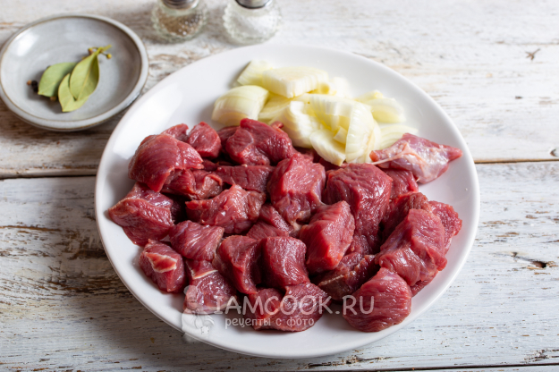 Говядину промойте под проточной холодной водой, обсушите. Нарежьте на небольшие кусочки. Также нарежьте произвольно очищенный репчатый лук.