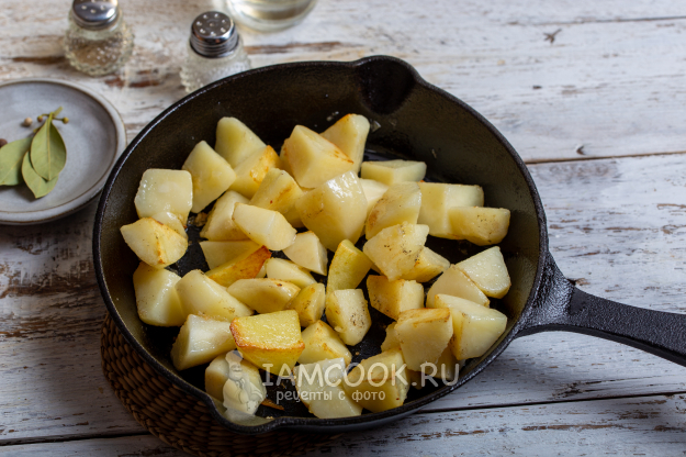 Отдельно обжарьте нарезанный картофель до румяной корочки. Это можно сделать на сковороде или предварительно, до приготовления мяса в мультиварке.