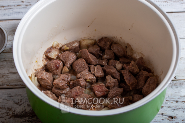 Выложите нарезанное мясо с луком и обжаривайте с открытой крышкой, постоянно помешивая, около 15 минут.