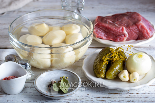 Возьмите указанные ингредиенты для приготовления азу из говядины в мультиварке. Говядину выбирайте свежую, без прожилок, и лучше отдать предпочтение мясу молодого животного. Овощи - среднего размера. Вместо томатной пасты можно взять кетчуп, томатный соус.