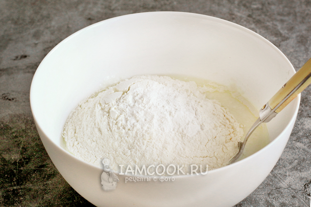 Добавьте муку с разрыхлителем, но не всю сразу. Добавляйте ее частями и вмешивайте ложкой в тесто. Затем на столе вымесите мягкое и чуть липнущее тесто. Не забивайте его мукой, чтобы булочки получились мягкими. Мне понадобилось 280 г муки.