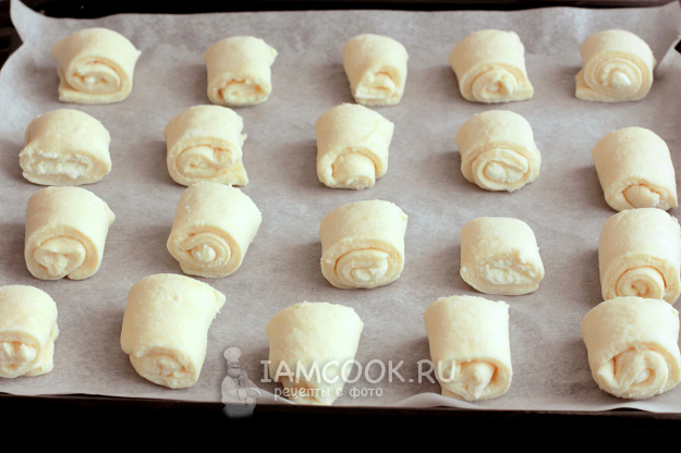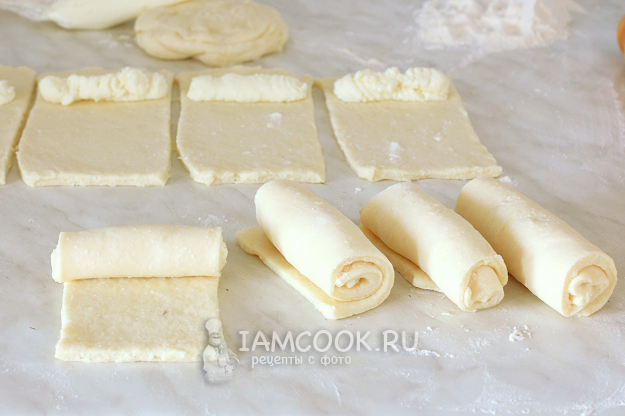 Прямоугольники сверните рулетом, НЕ защипывая края. Если будет лишний творог, то он вытечет при выпечке, а если края защипнуть, то тесто треснет, когда начнет увеличиваться и подниматься в духовке.