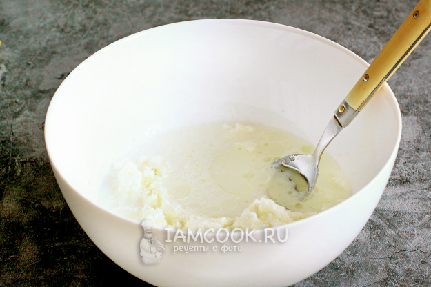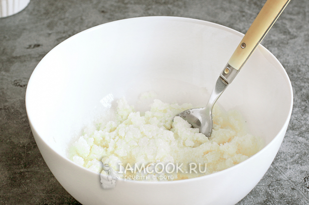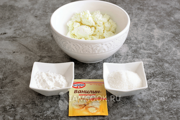 В миске соедините творог с сахаром, ванильным сахаром и солью. Перемешайте.