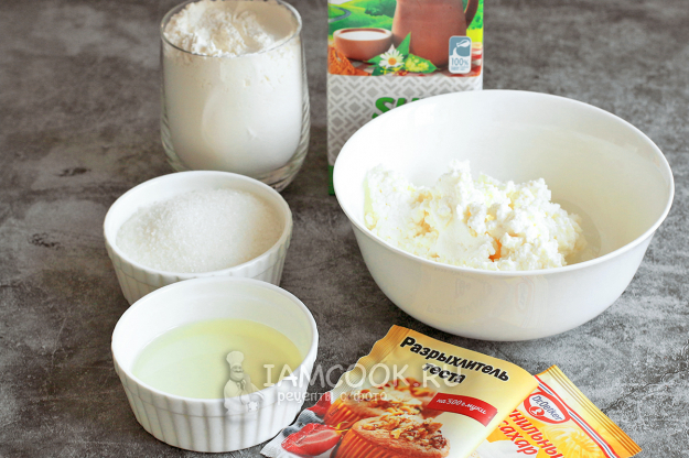 Итак, вот продукты для теста, из которого будем готовить творожные булочки с творогом в духовке. Здесь меня полностью устраивают все пропорции, но так как творог по вкусу и кислоте разный, то корректируйте количество сахара на свой вкус.