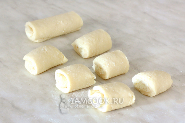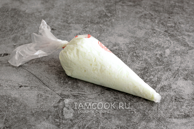 Поместите творог в кулинарный пакет и отрежьте кончик диаметром 1.5-2 см. Вместо кулинарного пакета можно взять плотный целлофановый или выкладывать начинку на тесто чайной ложкой.