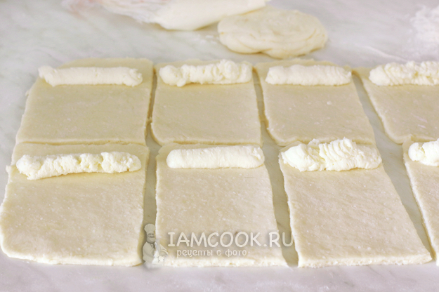 Припылите поверхность стола мукой и раскатайте тесто в единый пласт толщиной не более 5 мм. Тесто хоть и липнет слегка, но очень послушное в работе. Разрежьте тесто на одинаковые прямоугольники и выложите творожную начинку, оставляя по 2 см от ближнего края.