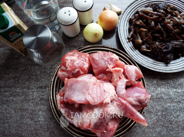 Итак, возьмём продукты для приготовления кролика в сливочно-грибном соусе и приступаем. Готовим в казане или воке.