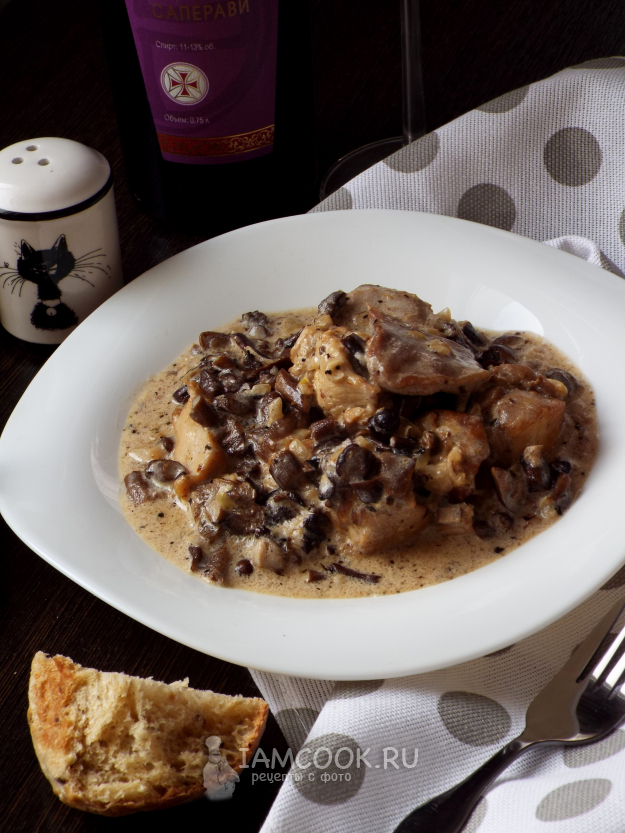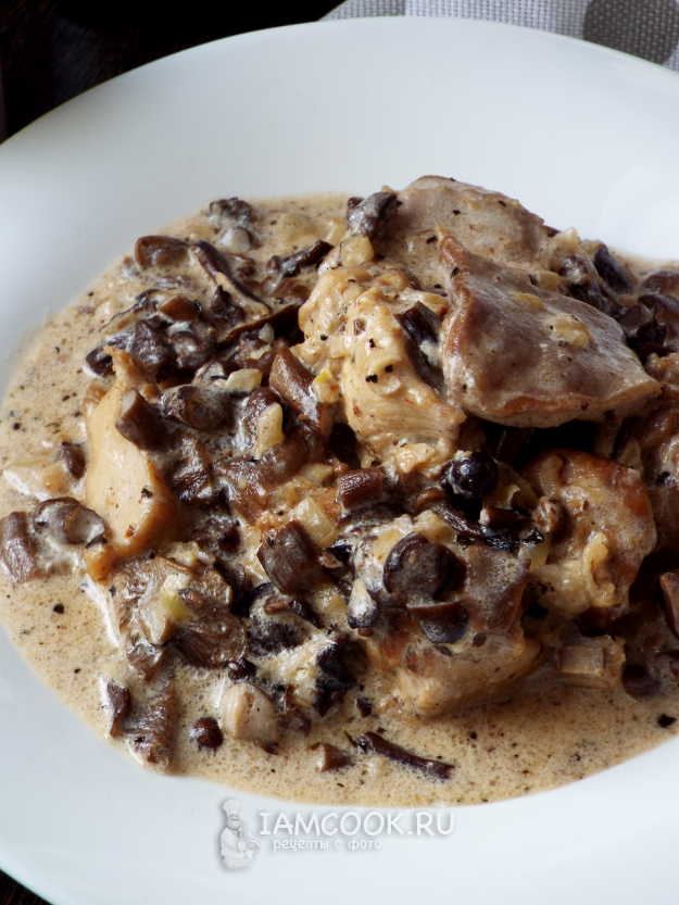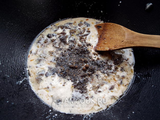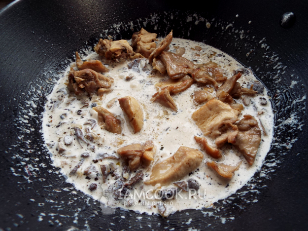Затем выложить грибы, перемешать. Влить сливки, посолить и поперчить по вкусу.