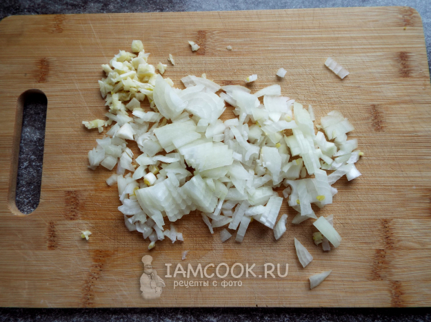 Кролика переложить на тарелку, а в этом же масле обжарить лук и чеснок.