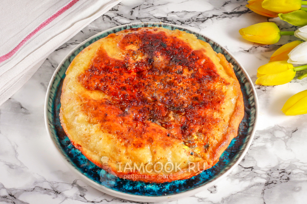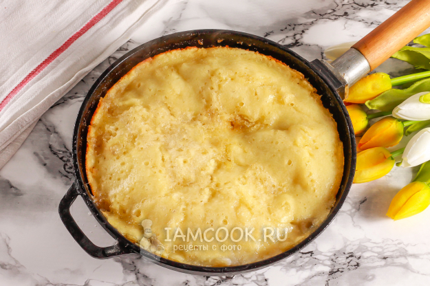 Накройте тарелкой сковороду и переверните пирог на тарелку. Затем с тарелки снова отправьте на сковороду, чтобы теперь и верх подрумянился. Затем снова переверните его на тарелку. Получается вот такая карамелизированная выпечка.