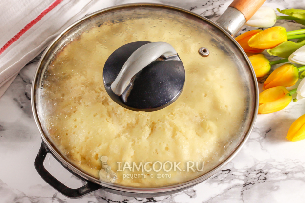 Убавьте нагрев до минимального и сразу же накройте сковороду крышкой. Обжаривайте банановый пирог на сковороде под крышкой примерно 20-25 минут - до того момента, как почувствуете яркий карамельный аромат с нотками банана.