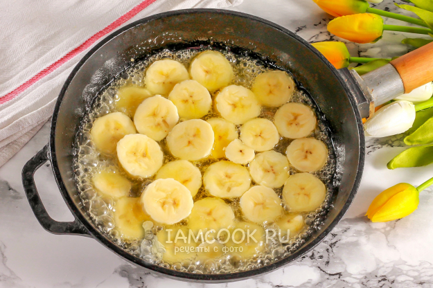Банан очистите и нарежьте кружочками. Выложите в карамель.
