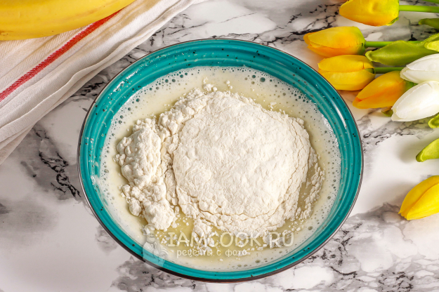 Всыпьте пшеничную муку, но пока без разрыхлителя. Его вы добавите перед заливкой теста в сковороду. Аккуратно вмешайте муку, но не взбивайте.