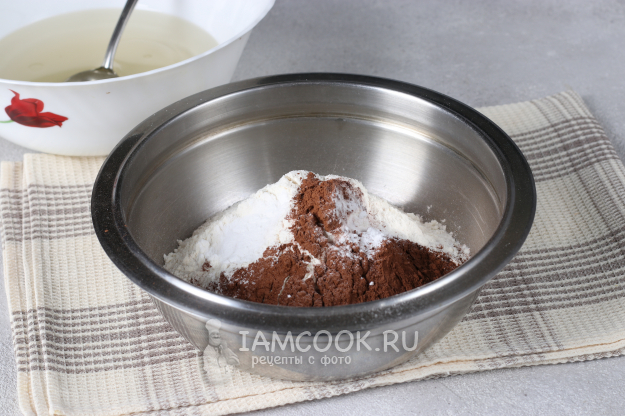 В отдельной миске смешать просеянную муку, какао, ванилин, соду и разрыхлитель.