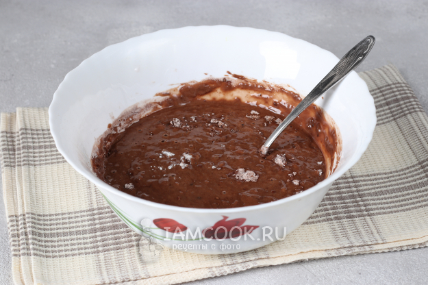 Добавить сухие ингредиенты к жидким и перемешать тесто ложкой 10-12 раз. Тесто должно получиться густое.