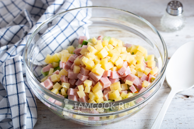 Сыр порежьте кубиком и добавьте к ранее нарезанным ингредиентам.