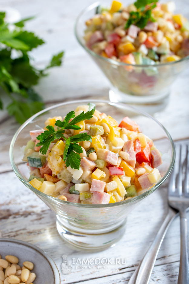 Выбранную ветчину освободите от упаковки и плёнки, нарежьте кубиком и добавьте в салат.