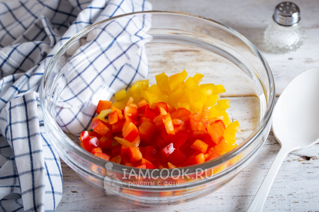 Болгарский перец помойте, удалите плодоножку и семена. Нарежьте перцы небольшим кубиком и выложите в салатник.