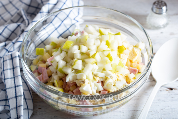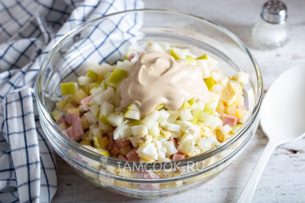Грушу помойте. Если шкурка очень твёрдая, то её лучше срезать. Порежьте грушу кубиком, добавьте в салат. Добавьте и очищенные нарезанные яйца.