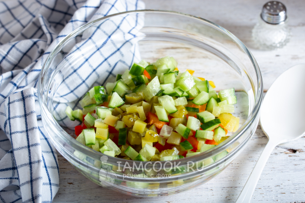 Свежий огурец помойте и обсушите. Оба огурца (свежий и маринованный) нарежьте кубиком и добавьте в салатник.