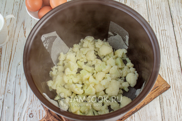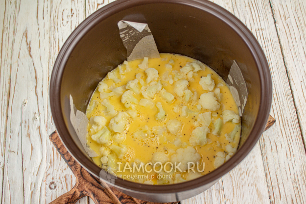 Чашу мультиварки смажьте растительным маслом. Для удобства (при доставании омлета), я выстелила несколько полосок пергамента (делать это не обязательно). Выложите цветную капусту и распределите по дну чаши.
