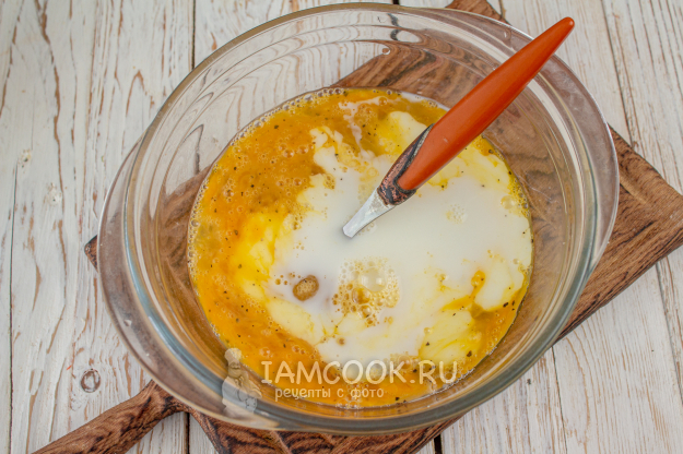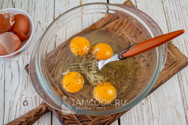 Яйца вбейте в подходящую посуду, добавьте соль и черный молотый перец, перемешайте.