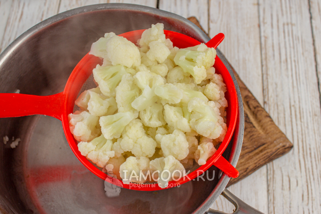 Я использовала свежую цветную капусту, ее лучше немного отварить, хотя бы 3 минутки, но если вы используете замороженную, то ее отваривать не надо, а следует всего лишь разморозить и отжать от лишней влаги.
