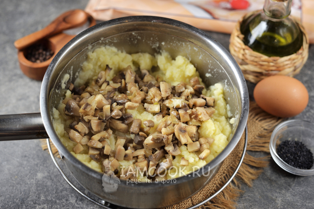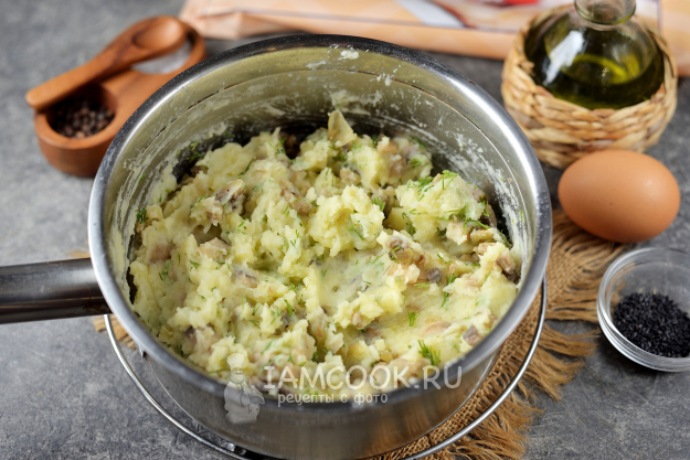 Переложите в пюре обжаренные грибы с луком, соль и перец по вкусу, а также нарубленный укроп, если есть в доме.