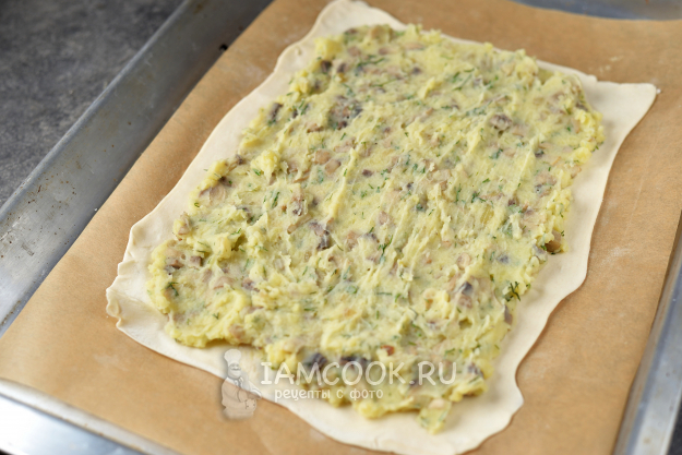 Тесто разделите на две одинаковые части, тонко их раскатайте. Выложите один пласт теста на противень, выстеленный пергаментом. Слой теста смажьте приготовленной ранее начинкой из картофеля с грибами.
