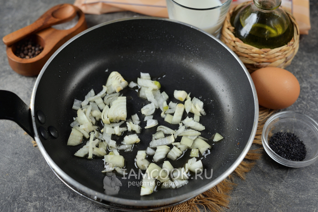А пока нарежьте лук мелким кубиком, обжарьте в минимальном количестве растительного масла до мягкого состояния, минуты 3.