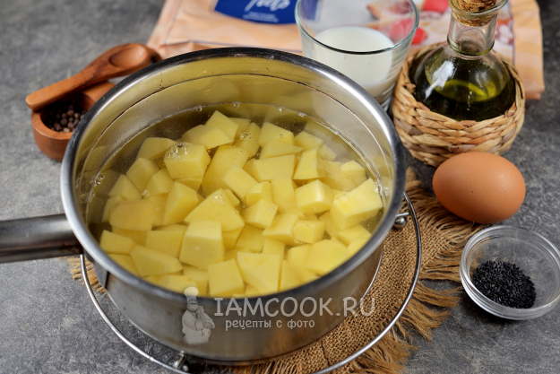 Картофель нарежьте кубиком, отварите минут 12-15 до готовности.