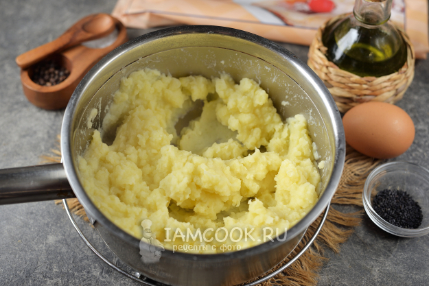 Когда картофель будет готов, слейте воду, в которой он варился, влейте молоко и пробейте все до состояния однородного пюре. Густоту регулируйте количеством молока, пюре не должно быть ни густым, ни жидким.