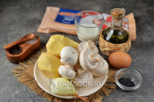 Подготовьте все необходимые продукты для пирога из слоеного теста с картошкой и грибами. Картофель и лук почистите, помойте вместе с грибами под проточной водой, обсушите. Тесто заранее разморозьте.