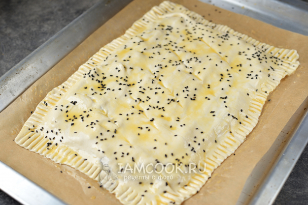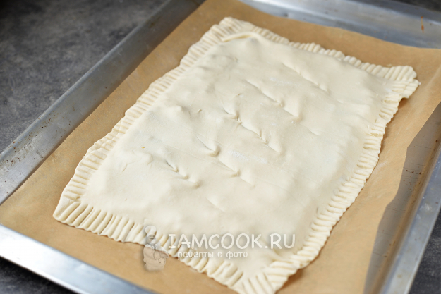 Накройте второй половиной слоеного теста, по краям прижмите зубцами вилки, сверху сделайте несколько надрезов острым ножом.